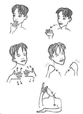 The open hands are placed on the chest, then form sign language for "S," palms facing the body, as the hands move up and away from the chest