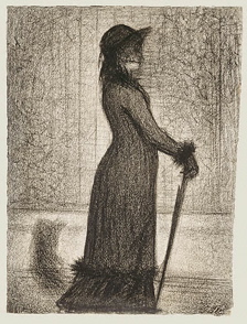 Georges Seurat’s drawing; Woman Strolling was mysterious as a woman stands in a silhouetted profile. The sketch looked grainy. I was curious about the woman’s features, so I got closer thinking that I would see more detail, but instead I only saw black dots. When Seurat, also a post-Impressionist, painted he used his own technique of making tiny dots to form his figures known as pointillism, but when he sketched he used textured paper to give a similar effect. I stood back to look at the drawing as a whole and I realized Seurat’s authentic style and brilliance in achieving it. I was pulled to all of his pieces because he used dots to create a recognizable image.