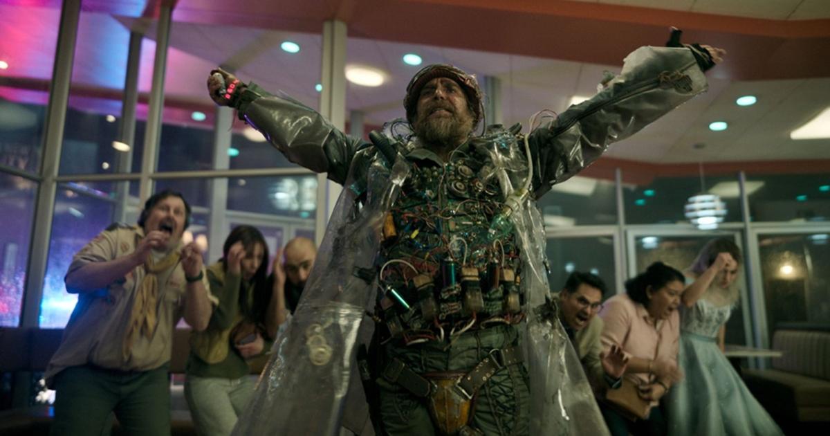 A decrepit man (Sam Rockwell) storms into an American diner, wrapped in a plastic coat and with what appears to be a bomb attached to his body. There he announces that he comes from the future – with a mission: He wants to save humanity from an impending AI apocalypse. He warned that the cause of the downfall was, of all things, smartphones. People became more and more preoccupied with their screens until they couldn’t get out of bed. The time traveler claims to know the solution, but he needs supporters: volunteers from the diner who want to embark on a daring adventure. It’s not his first attempt – he’s stood in this exact location 116 times before, looking for his ideal team. But this time, he is convinced, everything will be different.